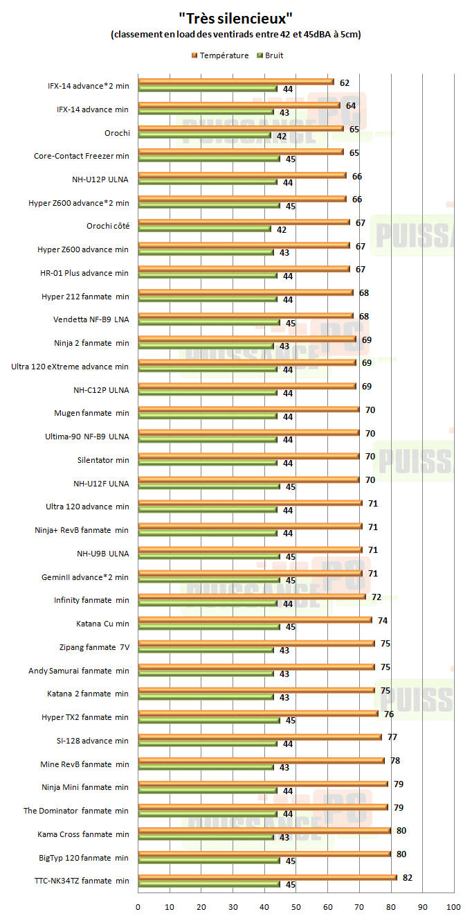 Une fois de plus l’IFX-14 mène la danse lorsqu’il est équipé de 2 ventilateurs très silencieux, ce qui permet d’augmenter sensiblement le flux d’air mais pas le bruit et donc de creuser l’écart. Le Scythe Orochi avec son ventilateur inaudible d’origine offre néanmoins une très belle prestation derrière. Noctua NH-U12P et Sunbeam Core-Contact Freezer, chacun en vitesse minimale grâce aux variateurs de vitesses fournis dans leurs bundles respectifs complètent cette tête de liste des références aux silence exceptionnel malgré des performances de haut vol.