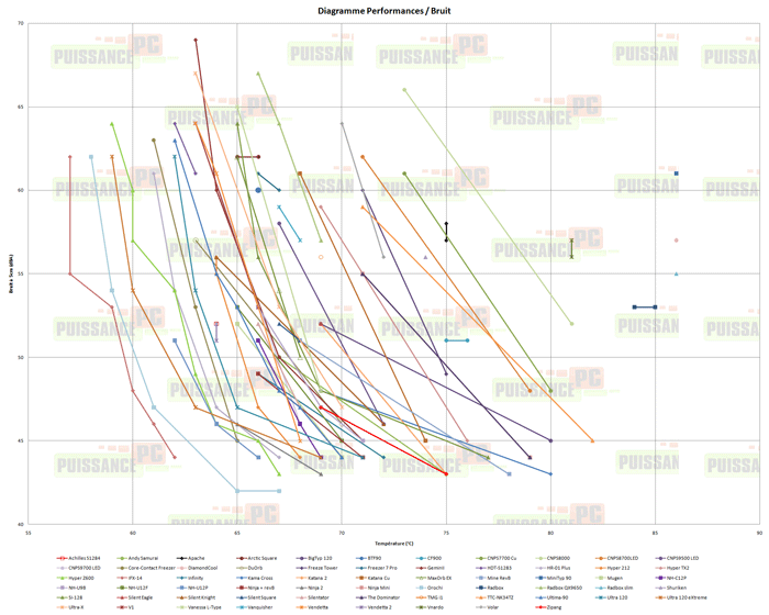 Pour faire simple pour ceux qui ne seraient pas habitués à voir ce type de graphes, la zone maximale d’efficacité, réunissant basses températures et niveaux sonores, se situe en bas à gauche du graphe. Les ventirads donc la représentation graphique réalise un arc le plus proche possible du coin en bas à gauche du graphe sont donc ceux disposant du meilleur rapport performances/bruit.