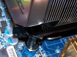 Le 4è clip de fixation est d’ailleurs même complètement masqué par le ventirad, mais Asus a eu la bonne idée de rajouter une petite barre en plastique pour permettre de bloquer/débloquer le système de sécurité du clip plus aisément. Elle n’aide par contre pas pour enfoncer le clip, il ne faut donc pas avoir de trop gros doigts pour pouvoir pousser ce clip bien droit.