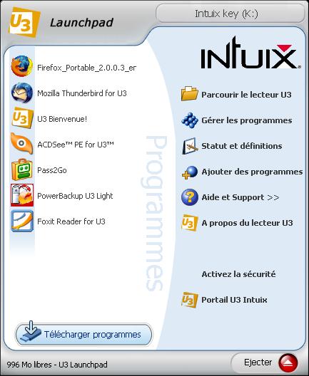 Lorsque l’on connecte la clé a un port USB on est surpris la première fois par l’apparition d’un pop-up présentant une animation (les petites boules roulent vers la clé) à l’effigie d’intuix et arborant le logo U3. A noter que ce pop-up varie également selon la version du LaunchPad, la dernière version sortie pour améliorer la compatibilité Vista est beaucoup plus discrète.