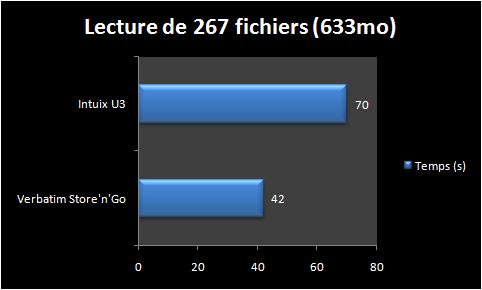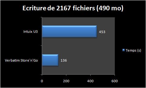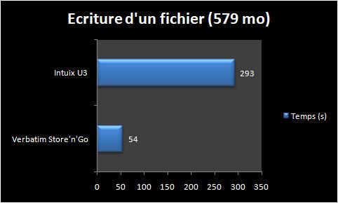 Si c’est mieux en données absolues pour l’intuix (2 Mo/s) qui se rapproche de ses données constructeur (4 Mo/s) on est par contre très loin de la Store’n’Go Pro. (10,7 Mo/s) Inutile d’insister sur le coté décevant de cette clé en terme de performance.