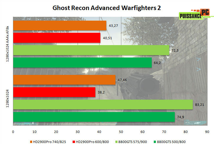 Analyse : Ca commence bien mal pour le HD2900Pro, et ce quelle que soit la résolution choisie. A sa décharge en HD2900XT ce n’est franchement pas plus reluisant, le 8800 étant intouchable sur ce jeu. On sent néanmoins que cette limitation des performances est due en très grande partie à une immaturité des pilotes, bien que ceux choisis pour le dossier furent les plus récents. Cela montre à AMD que son travail sur les pilotes n’est pas encore fini, et que le chemin sera aussi long pour lui qu’il le fut pour Nvidia pour trouver des pilotes dignes sous Vista.