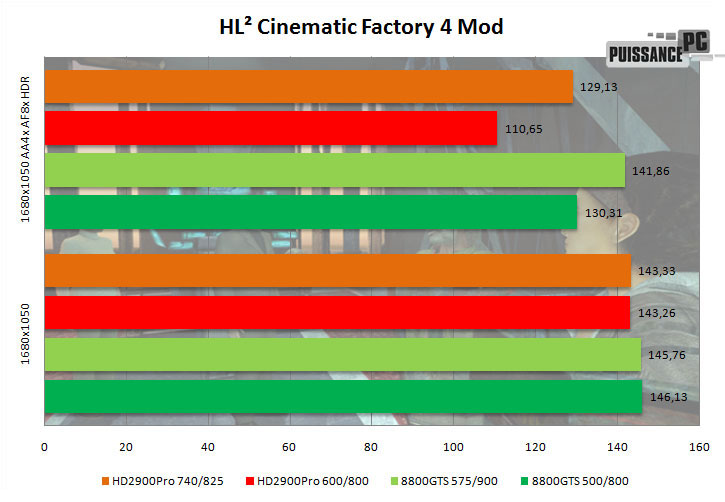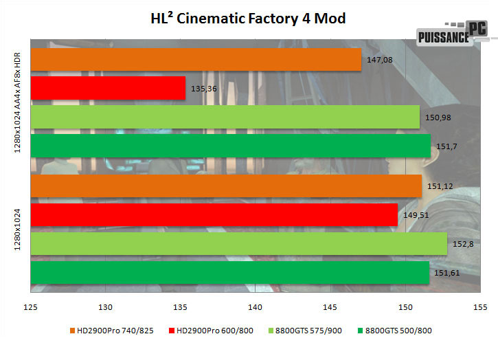 Analyse: Le HD2900Pro confirme sa bonne tenue, bien qu’en étant en retrait par rapport au HD2900XT et au 8800GTS. Néanmoins, le niveau de performances est tel que 110 ou 140 images par secondes n’influencent pas l’expérience de jeu, et il faut être drôlement affuté pour voir une quelconque différence dans le framerate. Même si les résultats sont moins bons, le HD2900Pro est quand même un sacré client, surtout à 247 euros.
