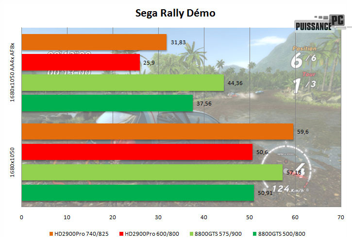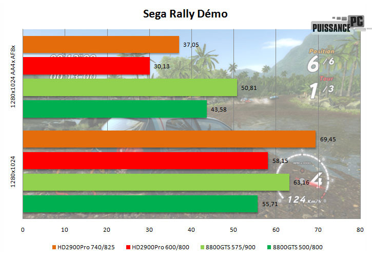 Analyse: Sans filtres, les HD2900Pro et XT sont à la fête et dominent les 8800 de peu , certes, mais dominent. Dès que l’on ajoute des filtres, le jeu change de bord et les 8800 sont bien moins impactées par les filtres que les HD2900. La faiblesse chronique des HD étant très bien expliquées ici, nous ne serons pas surpris de ne voir pour l’instant aucun cas ou elles dominent avec filtres. Ca reste quand même jouable, mais des micro freeze se font sentir, que nos 3Go de mémoire système ne peuvent expliquer. Ceci étant toutes les options ont été réglées à fond, et ce n’est à la base pas le segment taillé pour le HD2900pro.
