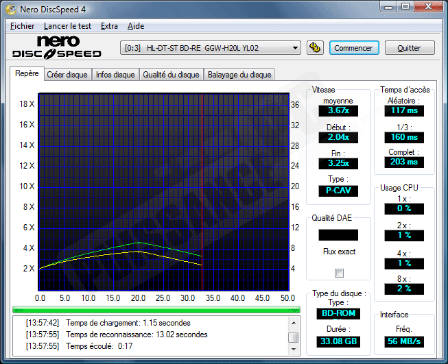 Au tour d’un Blu-ray double couche pressé de 32Go (incomplet). On atteint 5x max. soit une moyenne aux alentours de 3,7x. A noter que l’on ne peut pas comparer les vitesses "en x" d’un support à un autre. En effet, 1x BR correspond à 4,5Mo/s contre environ 1,4Mo/s pour 1X DVD et 150Ko/s pour 1x CD.