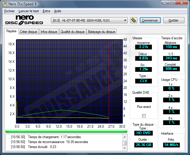 On attaque par un HD-DVD vidéo pressé double couche. Conformément aux spécifications du H20L, on atteint une lecture CAV Max de 3x soit une moyenne de 2,27x sur ce disque.