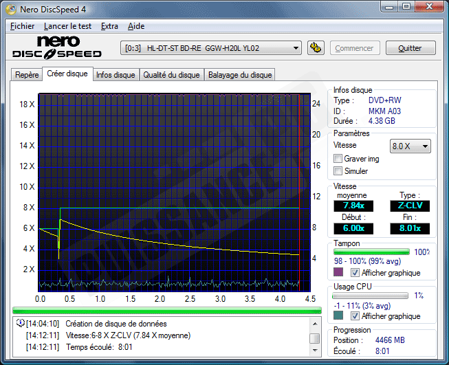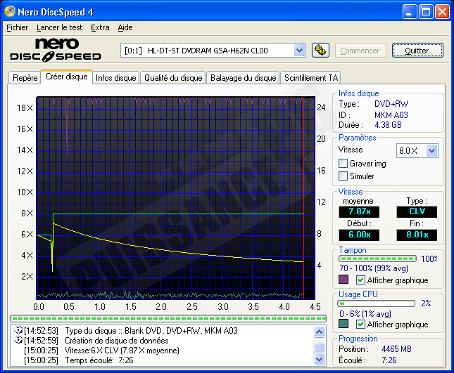 On continue avec les DVD en optant pour un +RW Verbatim certifié haute vitesse. A nouveau type de disque, nouvelle stratégie de gravure! On a le droit cette fois à du Z-CLV (Zone CLV: le graveur utilise une vitesse linéaire constante par zone du disque. Ici 6x en début de disque et 8x jusqu’à la fin). Il faut dans ces conditions 8mn pour graver les 4,38Go soit un temps très honorable pour ce type de média.