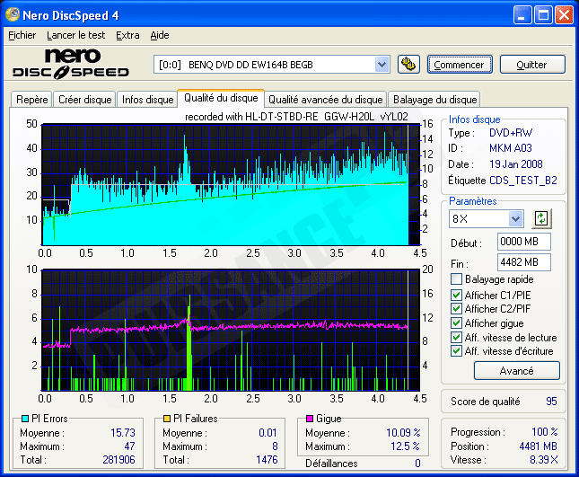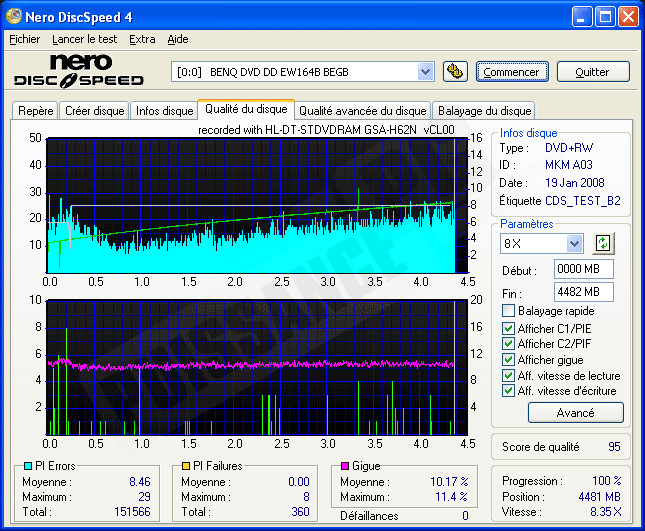 A nouveau 95 en indice de qualité pour le H20L, les DVD+R/W semblent lui convenir avec une bonne vitesse de gravure et une qualité très correcte.