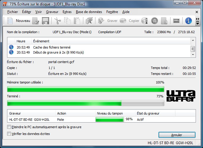 Pour résumer notre première expérience de gravure Blu-ray, un mot la traduirait, frustrante. Frustrant de devoir farfouiller dans les réglages avancés du logiciel (Nero) pour obtenir la vitesse souhaitée. Certes ce n’est pas bien compliqué, encore faut-il le savoir… Passons au double couche.
