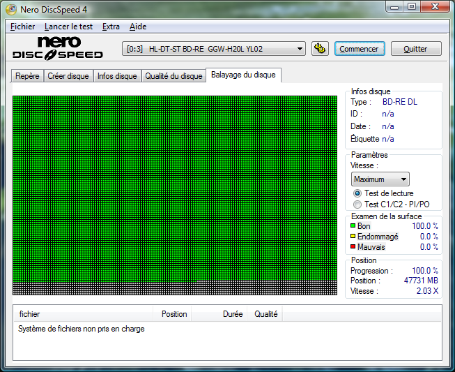 Vérifions à présent la qualité du disque. Pas de soucis à noter, le disque est lisible sans le moindre soucis et le scan parfait.