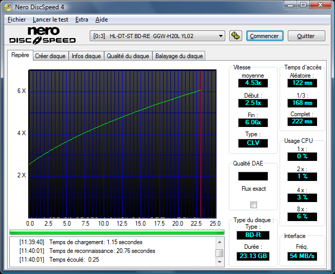 En mode 6x, la gravure de 23 681Mo prend un peu plus de 22mn. Cela correspond grosso modo à un mode 4x CLV : on peut donc supposer que la gravure s’effectue en 6X CAV, le temps additionnel étant imputable aux phases de préface et clôture du disque. Le comportement lors de la gravure semble indiquer une vitesse de rotation constante et donc nous conforter dans cette hypothèse.