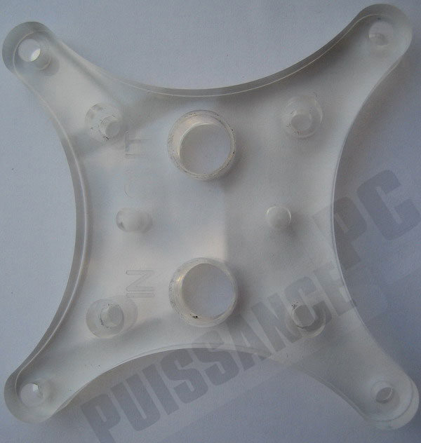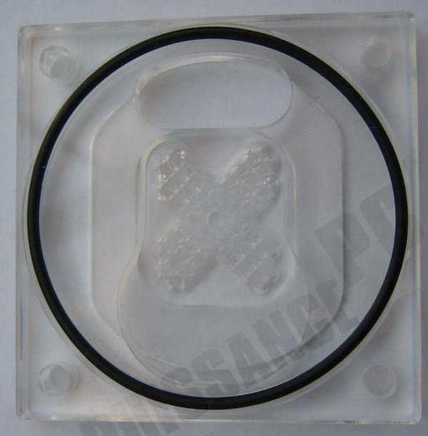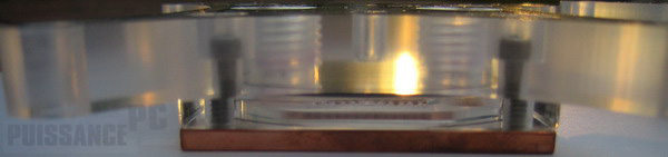 Passons à présent à la fameuse plaque intermédiaire différenciant le XP du X2 HF. Sur le X2, elle est métallique (cuivre & nickel) alors que sur le XP HF elle est comme le top intégralement en plexi. Lors du montage elle se trouve juste sous le top est au dessus du maze. L’étanchéité avec le top est assurée par un joint torique et l’on distingue très nettement les jets disposés de manière à former un X.