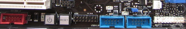 De gauche à droite: un connecteur clavier PS2, (ah bon certains l’utilisent encore?) son compère pour la souris cédant avantageusement la place à 2 USB. Viennent ensuite les connecteurs optique et coaxial, le fameux bouton poussoir clear CMOS (dés)activable et un connecteur firewire. A noter que les radiateurs affleurent au niveau du panneau pour profiter de l’air frais extérieur au boitier. Suivent ensuite 2 pavés composés d’un Duo d’USB surplombés par un connecteur RJ45 pour le réseau. Voilà c’est tout.