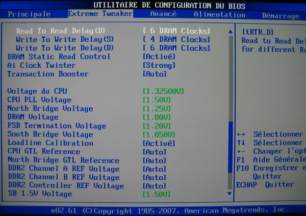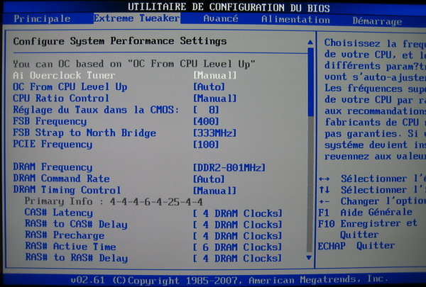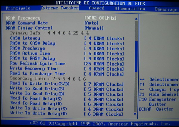Le FSB est poussé à 400mhz et la mémoire synchronisée avec ce dernier pour atteindre la norme PC6400. (ou DDR2-800) Le coeff. fixé à 8 permet une fréquence finale de 3,2ghz relativement "facile" pour une Core2 Q6600. (surtout en révision G0) Le command rate est laissé sur auto car avec 4 barettes, le mode 1T ne boot pas. Les timings principaux sont réglés sur des valeurs relativement correctes pour de la DDR2.