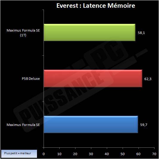 Toujours un avantage du même ordre entre P965 et X38, le passage à 1T n’apporte rien à nouveau…. Pour conclure nos tests mémoire, voyons la latence: