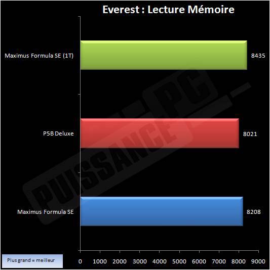 Nous utilisons Evrest dans sa version 4 afin de mesurer l’efficacité du controleur mémoire dans les domaines de lecture/ecriture/latence. Pour information, le mode 1T activable avec 2 barettes sur cette Maximus a été également ajouté. On attaque par les performances en lecture.
