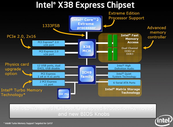 Premier point à noter, l’utilisation du PCIE dans sa révision 2.0 qui double tout simplement le débit par rapport à la version précédente soit 16Go/s (8go/s par sens) dans le cas d’un port 16x et permet de délivrer une puissance électrique supérieure pour alimenter des cartes plus gourmandes. Pour ne rien gacher, ce X38 gére 32 lignes, de quoi câbler intégralement 2 ports PCIE 16x contrairement aux précédents chipsets Intel.