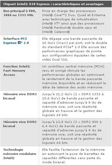 Pour le reste, c’est du connu avec le support officiel du FSB1333 et de la DDR2 ou 3 à l’instar du P35. En résumé voici les points forts de ce MCH: