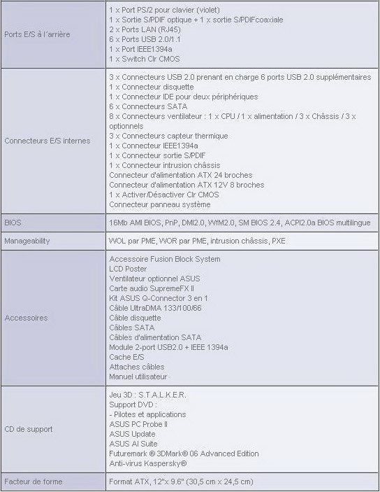 Le X38 selon Intel c’est bien, mais voyons à quelle sauce l’a agrémenté Asus avec cette carte mère visant clairement le segment très haut de gamme car faisant partie de la série Republic of Gamers. Tout d’abord les caractéristiques définies par le constructeur: