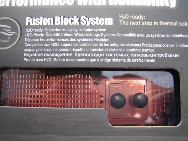 Quant à la seconde lucarne, elle permet de découvrir le système de refroidissement hybride dévolu au northbridge, le Fusion Block System: