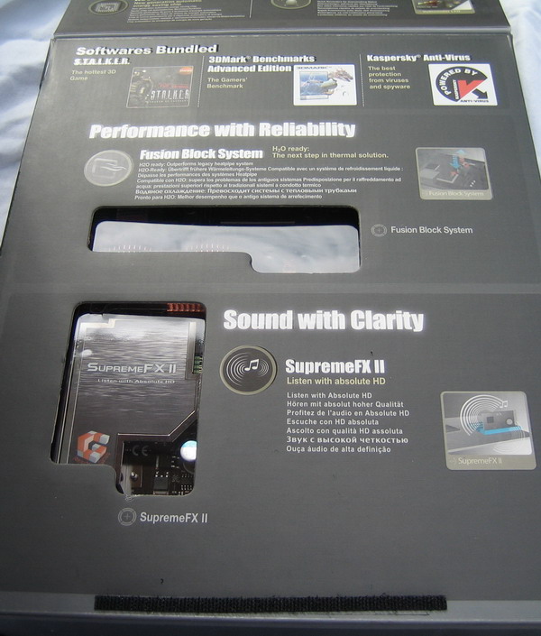 Dans le même style, la face avant de la boite dispose d’un rabat en carton maintenu en place via un "scratch". Un petit effort et hop on découvre encore plus de notre fameuse carte mère: