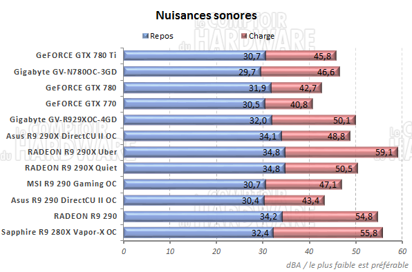 Comment se comporte le refroidisseur spécifique du constructeur sur ce modèle ? Pour cela 2 clichés en thermographie infrarouge. Au repos, on note un point plus chaud au niveau d’un composant de puissance situé au dos de la carte. C’est ce même composant qui atteint la température maximale en charge avec plus de 82°C, le GPU se stabilisant à 75°C et l’étage d’alimentation à moins de 70°C, soit des excellentes valeurs et surtout en deçà de la limite des 80°C (pour le premier cité) de GPU Boost, synonyme de fréquence réduite.
