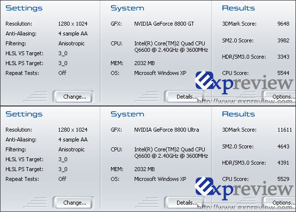 Le résultat final a, comme on pouvait s’en douter, donné raison à la 8800 Ultra avec un score global de 11611 points, mais la 8800 GT s’est vraiment bien défendue avec tout de même 9648 points. (Source: Expreview)