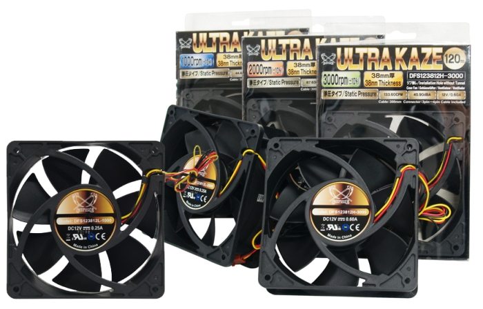 Les Scythe Ultra Kaze 120 sont au nombre de 3 tout d’abord, la différence entre les trois modèles étant leur vitesse de rotation lorsqu’ils sont alimentés en 12V (tension nominale):