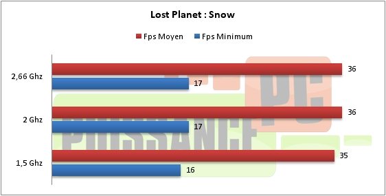 Snow est Gpu limited. Ici, peut importe que nous soyons à 1.5 ou 2.6 Ghz, tout semble dépendre de la carte graphique. Malgré la présence d’une 8800 GTS bien boostée, la fluidité est relative, pour un rendu graphique qui n’a rien d’extraordinaire.