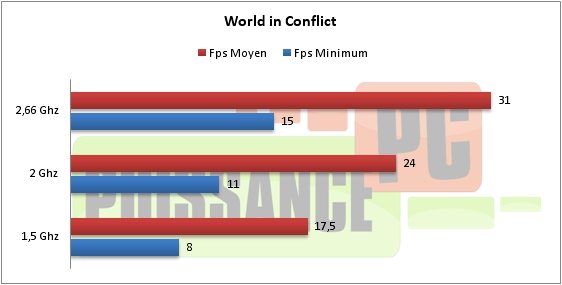 World in Conflict est lui aussi Cpu dépendant. Le souci c’est que même à 2.66 Ghz les saccades sont fréquentes. C’est quasiment injouable à 1.5 Ghz. Relativisons, en jeu, c’est moins flagrant, mais parfois réellement saccadé. Ici, il faudra un Cpu costaud.