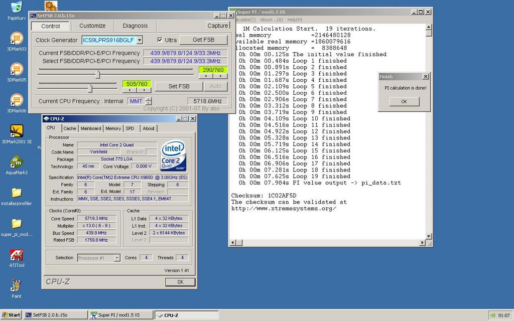 4 petits gras gars suédois et finlandais connus dans le monde de l’overclocking (Crotale, nosfer@tu,…) ont battu un record dans les labos d’Intel. Le matériel utiilisé était un QX9650 qui a été poussé à 5719 MHz sous azote liquide, et une 8800Ultra toute seule, le tout sur une carte mère Asus ROG maximus SE. Le record battu était celui de Super Pi 1Mo avec 7.891 secondes, le processeur ayant laché suite au bench grâce à un 2.175V des familles. Avant cela, la joyeuse équipe de bencheurs SDF avait topé 98 447 points au 3Dmark 2001 SE, 30 662 points au 2005 et 301.034 au score Aquamark. Voilà, c’était les stats du jour.
