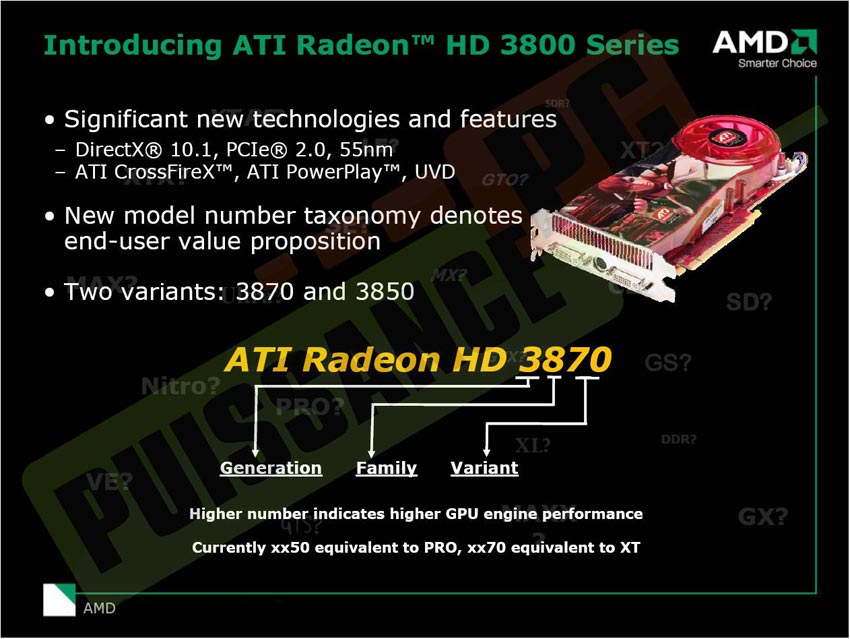 Au départ ces HD3800 devaient se nommer HD2950, pour marquer la continuité de l’architecture avec les HD2900, et ainsi suivre la démarche qui avait déja eu lieue avec les X1900 et X1950. Mais afin de ne pas noyer l’acheteur, AMD a jugé bon de renommer la gamme en HD38x0, finalement pour indiquer à ce dernier que la carte est plus récente que les HD29x0, et pour signifier qu’en théorie elle est plus puissante a gamme égale. Fini donc les cas où une carte à la momenclature récente était moins puissante que la génération d’avant, nous pensons aux 9500Pro qui étaient plus puissantes que les 9600 Pro bien qu’étant plus anciennes…