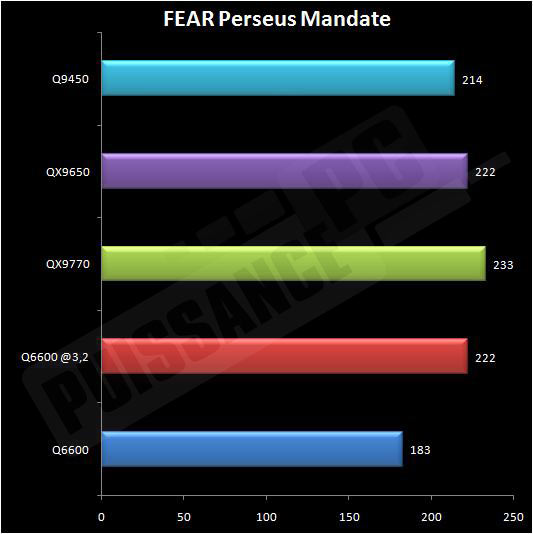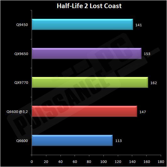 Si un petit doute pouvait encore subsister lors des 2 premiers tests, lorsque la limitation GPU s’estompe davantage cela confirme la supériorité de ce nouveau core avec les applications ludiques. Ceci dit l’écart n’est encore que de 5%. Le QX9650 égale à nouveau le Q6600 OC… Terminons notre panel ludique avec Half-Life2 Lost Coast et des réglages similaires aux précédents jeux: