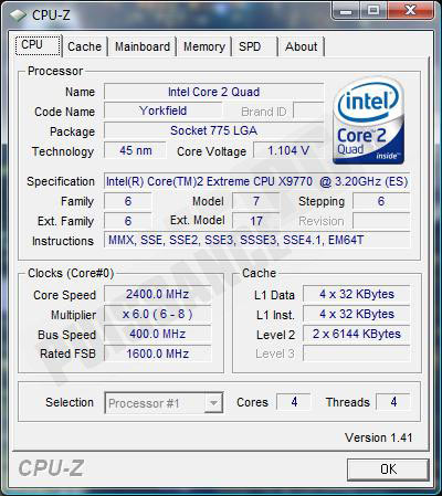 Le nom de code est bien Yorkfield composé de 2 Penryn. On retrouve donc 4 coeurs d’exécution, les 12mo (2×6) de cache L2 et la présence des fameuses instructions SSE4. La technologie 45nm permet une tension d’alimentation moindre du CPU, ici 1,1v au repos avec SpeedStep (abaissement de la tension au repos) et C1E (passage au coeff. 6 en IDLE) actifs pour une fréquence abaissée à 2,4ghz au lieu des 3,2ghz du processeur en charge.