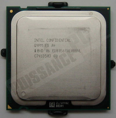 C’est un processeur ES confidential qui n’est pas destiné à être commercialisé et qui constitue généralement les préséries des CPU Intel. En dehors du marquage, difficile de lui trouver le moindre changement physique par rapport à n’importe quel Core2, le heat spreader protégeant le die du CPU des montages indélicats et des regards curieux.