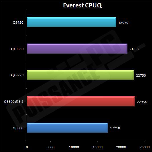 Un léger gain de 2,5% pour le nouveau venu face à un Q6600 à fréquence identique. Face au précédent fleuron Intel à savoir le QX9650, le gain atteint 7% soit à peine plus que l’augmentation de fréquence CPU. Le FSB 400 apporte donc quelque peu. Passons à Everest à présent avec le test CPU Queen pour la puissance brute multithread du processeur:
