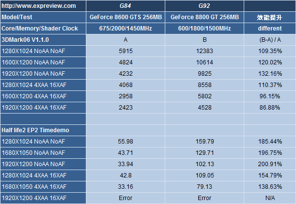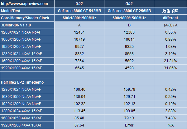 Le site eXpreview vient de mettre en ligne les premiers benchs de la toute proche 8800GT 256Mo, destinée à contrer la HD3850 d’ATI. Comme souvent nous allons devoir nous contenter de peu de jeux testés puisqu’au traditionnel 3DMark2006 est seulement ajouté Half Life 2 Episode 2. Par contre un grand nombre de résolutions sont testées, et la 8800GT 256Mo est tour à tour comparée à la 8600GTS, à la HD3850 256Mo et finalement à sa grande soeur la 8800GT 512Mo. Un premier test donc plus complet que ce que nous avions l’habitude de voir, et qui permet de constater que la carte semble s’en sortir vraiment bien et talonner la version 512Mo tant que l’on n’active pas les filtres ou que l’on ne dépasse pas le 1280*1024. Si le prix supposé de 180€ TTC est vérifié en pratique Nvidia semble détenir là une carte au potentiel énorme pour le milieu de gamme, 20 à 30% plus puissante que la HD3850 et supportant finalement mieux les filtres dans la guerre du milieu de gamme 256Mo.