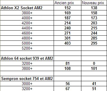 AMD a décidé de faire une baisse plutot conséquente sur ses processeurs socket AM2, 939 et 754. Sentant probablement venir la furia lors de la prochaine baisse chez Intel prévue pour le second trimestre 2007, il ne reste que la bataille des prix pour contrer Intel et ses core2duo. La baisse est d’autant plus importante que le modèle est "élevé" en performance rating. Cette réaction doit surement être provoquée par l’arrivée et la disponibilité ce jour des E4300 qui sont tout simplement les meilleurs processeurs entrée de gamme jamais fabriqués, et dont le prix le situe en regard du X2 4200+ AM2, mais loin devant en terme de performances. Bref AMD pédale dans la choucroute, et il n’est pas bon de voir cela, en espérant qu’AMD puisse proposer une plateforme pertinente et qui puisse rivaliser en termes de perfs, avec un choix de socket pérènne.