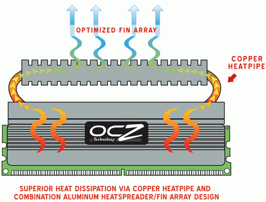 Le principe est simple, augmenter la surface d’échange pour le refroidissement des puces. Comme l’espacement entre les barrettes est limité sur les cartes mère, pas d’autres choix que d’augmenter la surface d’échange "par le haut". OCZ utilise donc ici un radiateur additionnel surplombant les barrettes et en liaison via un caloduc avec les dissipateurs latéraux recouvrant les puces. Ainsi, ce radiateur additionnel n’est pas en liaison directe avec les puces mais avec les radiateurs latéraux qu’il refroidit par conduction thermique comme expliqué dans le schéma ci-dessous.