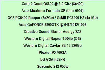 On réutilisera la base de nos précédents articles, à savoir une asus Maximus Formula SE flashée avec le dernier bios disponible à savoir le 0901, un Core2 Q6600 @3.2ghz et une 8800GTX. Le détail ci-dessous:
