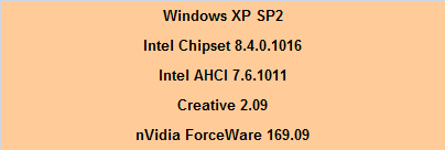 Pour le coté logiciel, nous réaliserons nos tests sous Windows XP SP2 en étant bien conscient que ce dernier ne permet pas d’exploiter l’intégralité des 4Go, mais là n’est pas le but de ce test (ni celui des benchs utilisés) comme expliqué précédemment. Pour le détail software c’est ci-dessous: