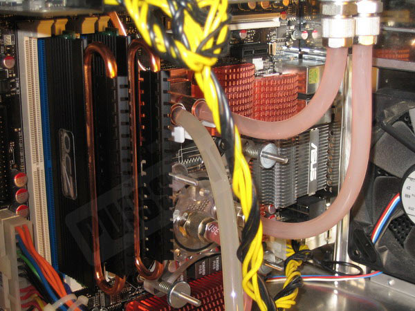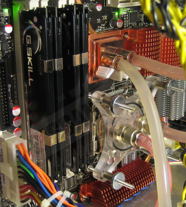 Pour finir, hormis le refroidissement liquide des CPU, Northbridge et carte graphique, un ventilateur 120mm en face arrière du boitier souffle de manière modérée (900tr/mn) en direction des radiateurs de la carte mère et des barrettes mémoires assurant ainsi le flux d’air nécessaire à leur refroidissement.