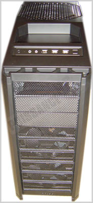 La façade supérieure frappe à son tour par la présence de la trappe d’aération imposante du ventilateur de 200mm, placé de façon vraiment intuitive puisque le flux de chaleur aura une tendance naturelle à s’échapper vers le haut, l’air frais étant plus lourd que l’air réchauffé. Sur cette façade nous retrouvons aussi un petit bac de rangement (pratique pour poser sa bière en LAN, même si Antec déconseille fortement cet usage précis) et l’ensemble de la connectique externe habituelle : 1 port firewire 400, 2 ports USB 2.0, et les prises casque et micro. En sus, l’unique LED bleue –d’activité des disques durs– et les boutons de marche/arrêt et de reset. A noter que l’on retrouve du plastique pour ce qui est de la façade supérieure et avant encadrant les baies frontales. S’il est certes de bonne facture, cela fait quand même bizarre de trouver cette matière sur un boitier de ce prix.