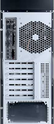 La façade supérieure frappe à son tour par la présence de la trappe d’aération imposante du ventilateur de 200mm, placé de façon vraiment intuitive puisque le flux de chaleur aura une tendance naturelle à s’échapper vers le haut, l’air frais étant plus lourd que l’air réchauffé. Sur cette façade nous retrouvons aussi un petit bac de rangement (pratique pour poser sa bière en LAN, même si Antec déconseille fortement cet usage précis) et l’ensemble de la connectique externe habituelle : 1 port firewire 400, 2 ports USB 2.0, et les prises casque et micro. En sus, l’unique LED bleue –d’activité des disques durs– et les boutons de marche/arrêt et de reset. A noter que l’on retrouve du plastique pour ce qui est de la façade supérieure et avant encadrant les baies frontales. S’il est certes de bonne facture, cela fait quand même bizarre de trouver cette matière sur un boitier de ce prix.