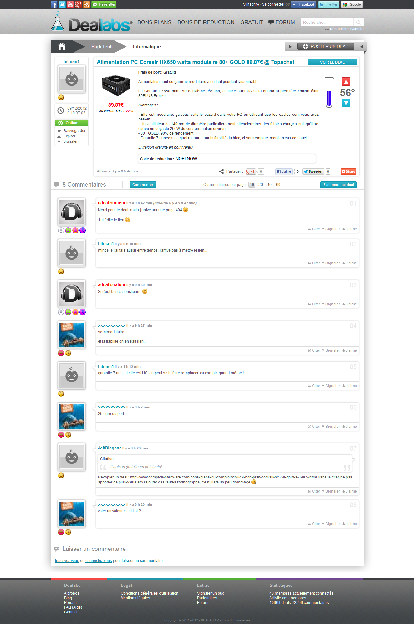 Enfin bref, revenons à notre histoire avec eux. En 2012, un certain romain931 membre de dealabs faisait des copier/coller de nos bons plans et c’est pourquoi Pascal les avait contactés, agacé par cette pratique. Vu qu’ils n’arrêtent pas de claironner que nos mails étaient agressifs et discourtois, les voici au format PDF pour qui veut les lire. Alors il est certain que leur réponse est courtoise et se veut même pleine de sens… Mais c’est là que l’hypocrisie démarre puisqu’ils disent en fin que la source sera donnée pour les offres récupérées chez nous, ce qui n’a plus jamais été le cas, car comme ils le disent si bien eux-mêmes, ils avaient décidé de ne purement et simplement plus parler de nous. Les agissements de romain931 ont stoppé net et ce brave garçon a disparu pour avoir un autre compte tout neuf à la place, nommé xxxxxxxxxxx, qui s’est donné comme seule mission de discréditer le Comptoir du hardware (un exemple de dénigrement ici sur un bon plan pompé) au sein même des billets ou des forums de dealabs, voire même jusqu’aller harceler des gens avec qui on travaille (MSI, Be Quiet!, Fractal Design…) et qui n’ont strictement rien à voir avec la choucroute. Oui oui vous lisez bien, et tout cela cautionné avec des likes de l’équipe dealabs. Un pote a lui s’est chargé de la suite du pompage et les pseudos ont changé à chaque fois.
