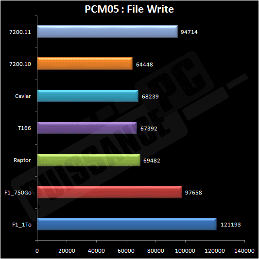 Ultime test HDD de PCmark05, File Write éprouve les capacités en écriture des disques durs. Là, c’est une démonstration du F1 1To tandis que la version 750Go fait légèrement mieux que le 7200.11(dont les perfs sont en légère baisse avec le nouveau firmware). Pour les autres c’est un tir groupé mais loin du trio de tête…