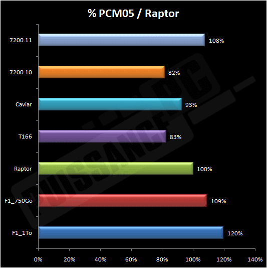 Pour finir, voyons le récapitulatif des performances sous PCMark05 via une moyenne pondérée de chaque test par rapport aux performances du Raptor. Visiblement PCmark05 ne réussit pas du tout aux 7200.10 et T166, ce dernier faisait pourtant une bonne impression au niveau des tests synthétiques. A contrario, les 2 Spinpoint F1 excellent sous PCMark05 et dépassent respectivement de 9% et 20% le Raptor et ses 10000tr/mn. Le 7200.11 fait jeu égal ou presque avec la version 750Go du F1 mais ne peut rien face au 1To (les performances applicatives sont d’ailleurs en légère baisse avec le firmware AD14 corrigeant le bug d’affichage du cache). Autant dire que la performance de ces 3 disques est excellente. Cela démontre également qu’il y a une différence non négligeable entre ces deux F1 pourtant vendus comme similaires au niveau des caractéristiques.