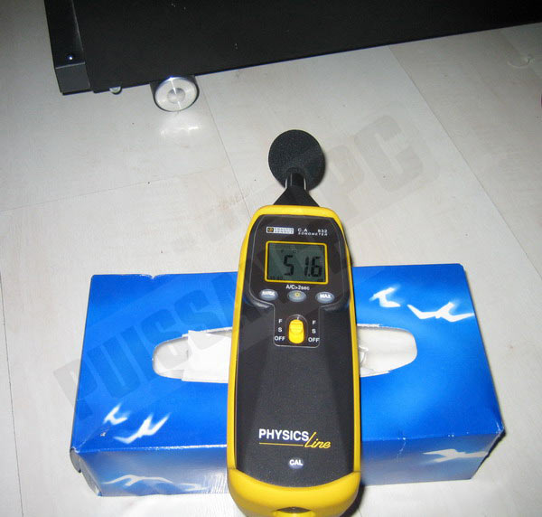 On ne peut pas qualifier ces disques d’inaudibles, toutefois dans la plupart des configurations, ils passeront inaperçus. Pour preuve l’expérience suivante: on mesure la pression acoustique à proximité de la tour (boîtier fermé) en fonctionnement, mais avec le Samsung F1 non alimenté. La valeur mesurée est 51,1db. On ouvre alors la tour pour alimenter le F1 avant de refermer le panneau latéral. F1 au repos, on ne note pas de différence, une fois sollicité l’écart est très restreint:
