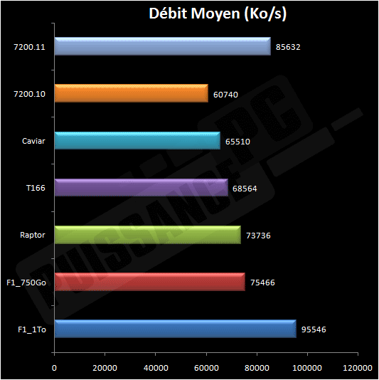 Si l’on traduit d’un point vue graphique le débit moyen sur l’ensemble du disque, on voit clairement la domination du Samsung F1 1To à ce test, suivi à bonne distance par le Seagate 7200.11, lui même devançant par un écart similaire le F1 750Go et le Raptor. Les autres disques sont à nouveau un cran derrière…