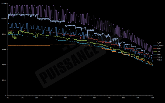 Voyons H2benchw, nous lançons pour chaque disque les tests puis nous traduisons les résultats numériques obtenus sous forme d’un seul et même graphique pour mettre en évidence les différences entre disques. Attaquant par les courbes de débit séquentiel: